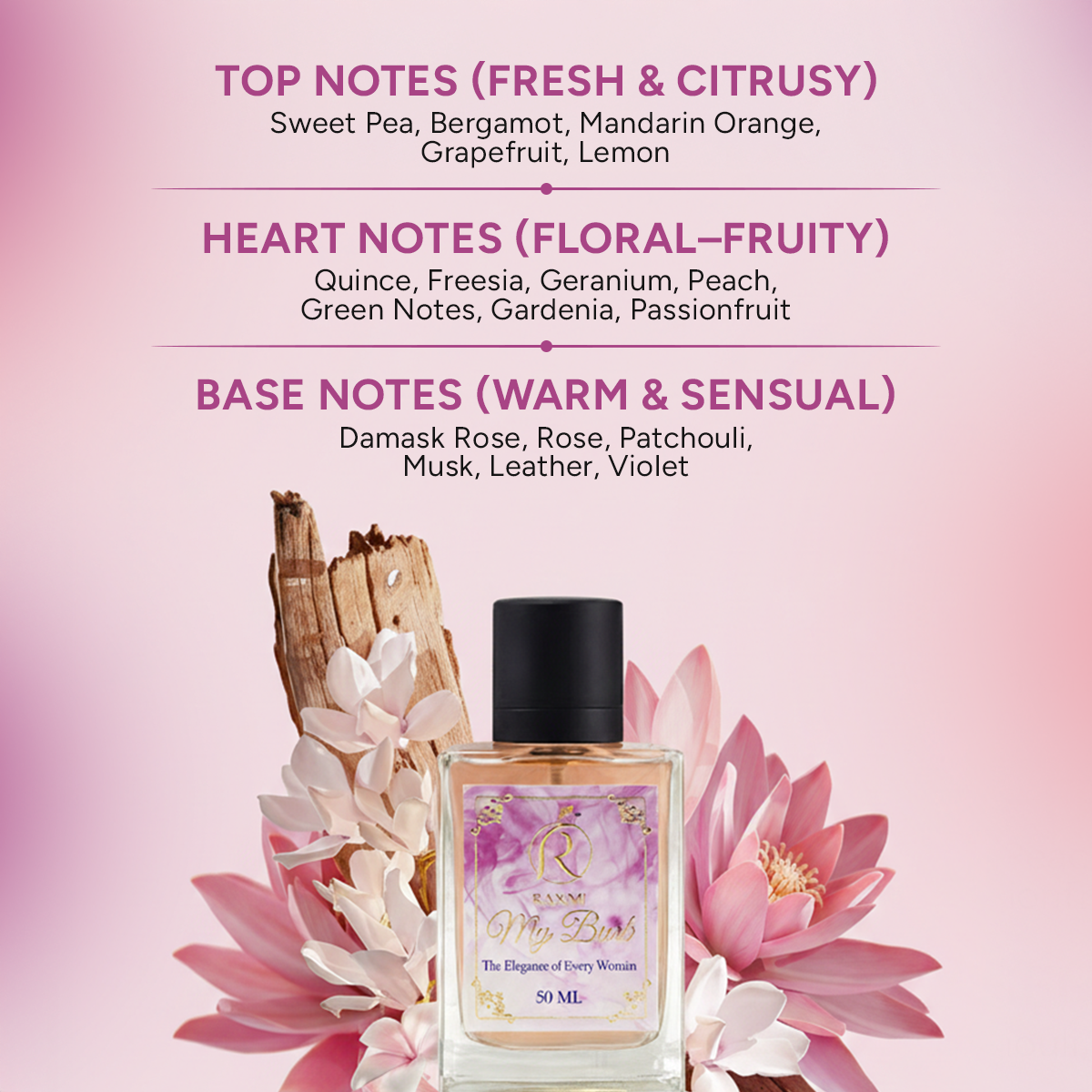 The fragrance opens with a refreshing blend of sweet pea and bright bergamot, giving a light, joyful, and uplifting start. In the heart, delicate floral notes of geranium and freesia combine beautifully with the soft fruity touch of quince, adding femininity and freshness to the scent.